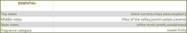 The lush sweetness of black currant, pear, and raspberry, weave a harmonious blend of fragrances that perfectly echo one another.